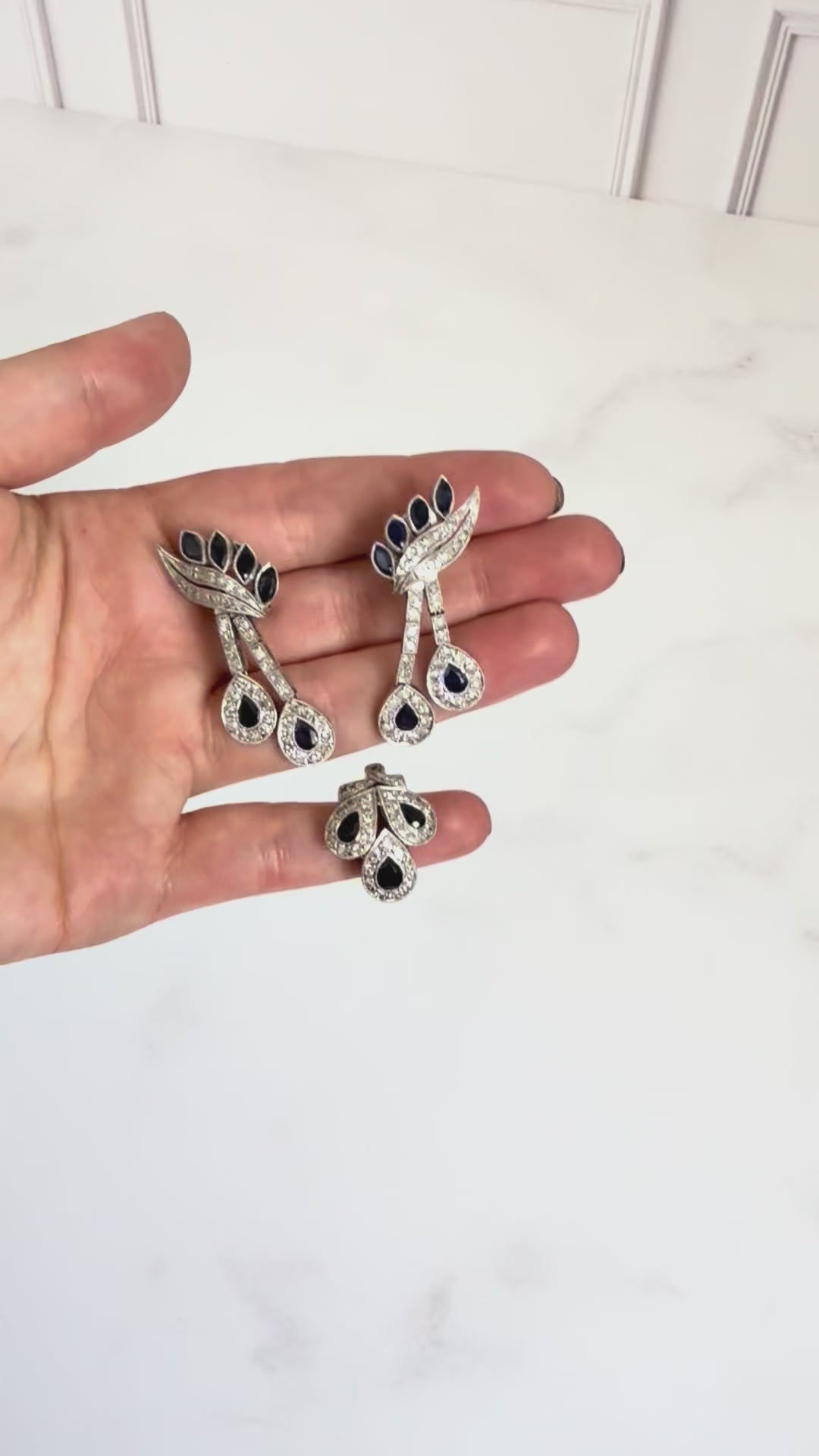 El estilo de este set con plumas y gotas era muy típico del Arte Déco y el contraste de diamantes con zafiros eran joyas características para asistir a bailes de medianoche en salones. Set ideal para novias, mamás de las novias o hermanas.